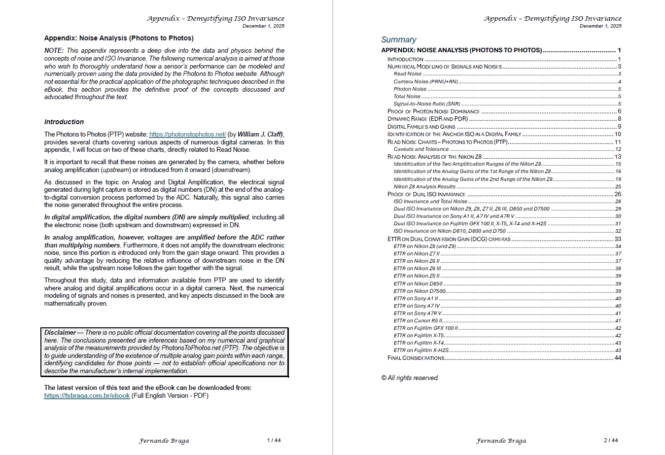 November/2025 – The histograms of the example photos in the eBook have been added, as well as a new Example 1.3, captured with the Nikon Z8 at the base of the second range. The appendix was expanded to include the Nikon Z5 II, D850, D7500, D810, D800 and D750; Sony A1 II, A7 IV and A7R V; and Fujifilm GFX 100 II, X-T5, X-T4 and X-H2S. In addition, PRNU noise is now taken into account in the appendix analyses.