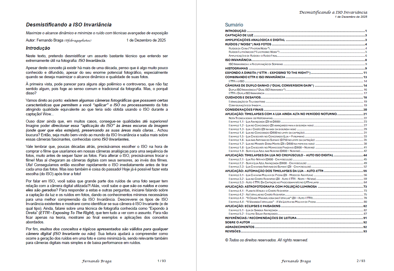 Agosto/2025 – A explicação sobre a amplificação do sinal de luz foi movida para uma nova seção “Amplificação Analógica e Digital”, enquanto a seção de ruído passou a conter apenas a parte sobre ruído e sua amplificação, facilitando a leitura e a compreensão. Aprimorada a explicação da redução do ruído eletrônico de saída na segunda faixa (tópico “Dupla ISO Invariância”). Novo exemplo adicionado: Exemplo 5.2 – “Eclipse Abençoado” com um Eclipse Solar Parcial posicionado sobre a estátua do Cristo.